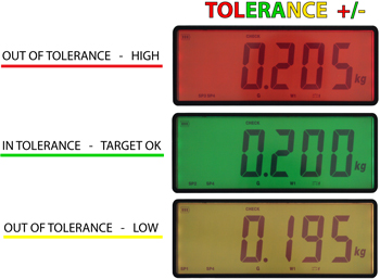 Bakgrundsbelysningens färg ändrar sig beroende på inställd vikt. Utmärkt för "check weighing"